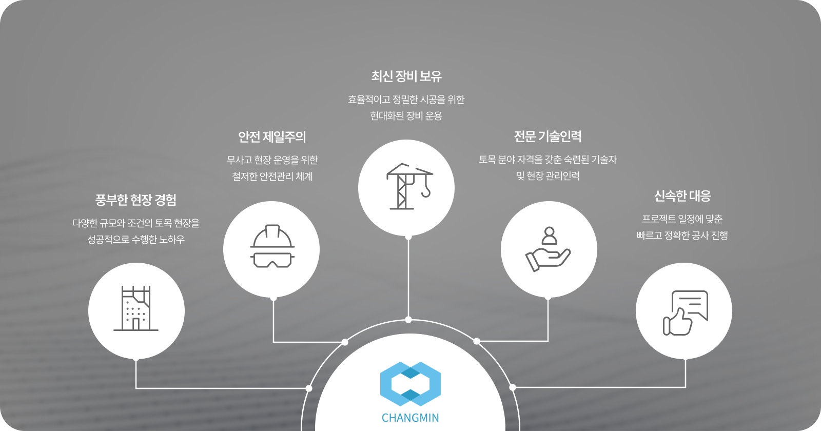저희 창민토건은 신뢰, 믿음, 안전, 정확성을 바탕으로 고품질의 토목공사를 수행하고 있습니다.